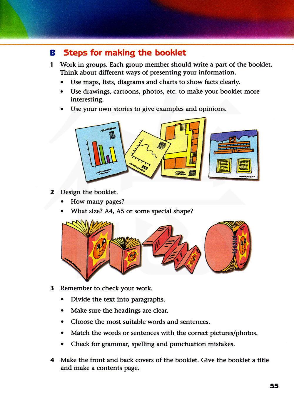 使用地图,清单,示意图以及图表来清楚地展示事实情况。 用图画,漫画,照片等来使你的手册更有趣。 使用你自己的故事来提供示例和意见。