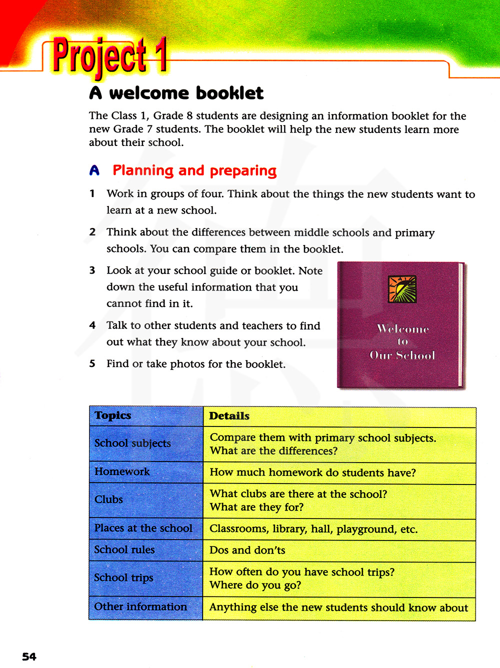 八年级一班的学生正在为七年级的新生设计一本信息手册。这本手册将帮助新生更多地了解他们的学校。