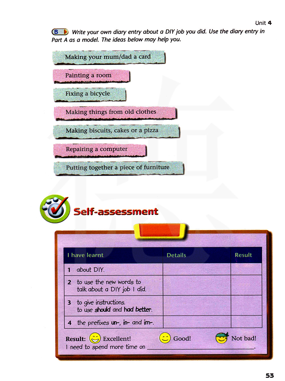 就你干过的“自己动手做”的活,写写你自己的日记条目。以A部分的日记条目为例。下列的想法可能会帮到你。