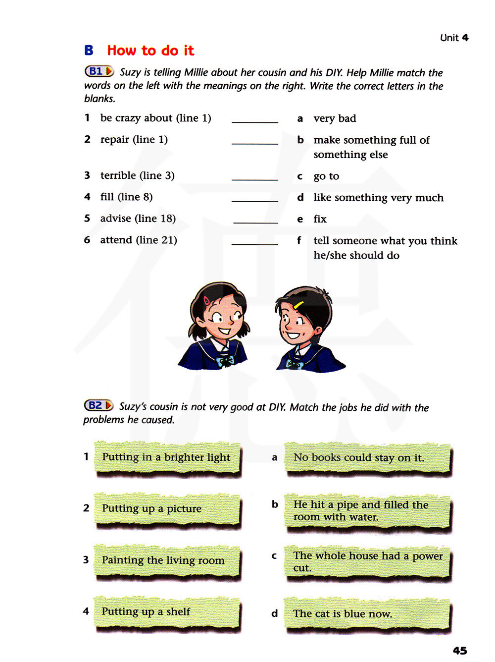 苏西的表兄不是很擅长DIY,把他所做的工作与他引起的问题进行搭配。
