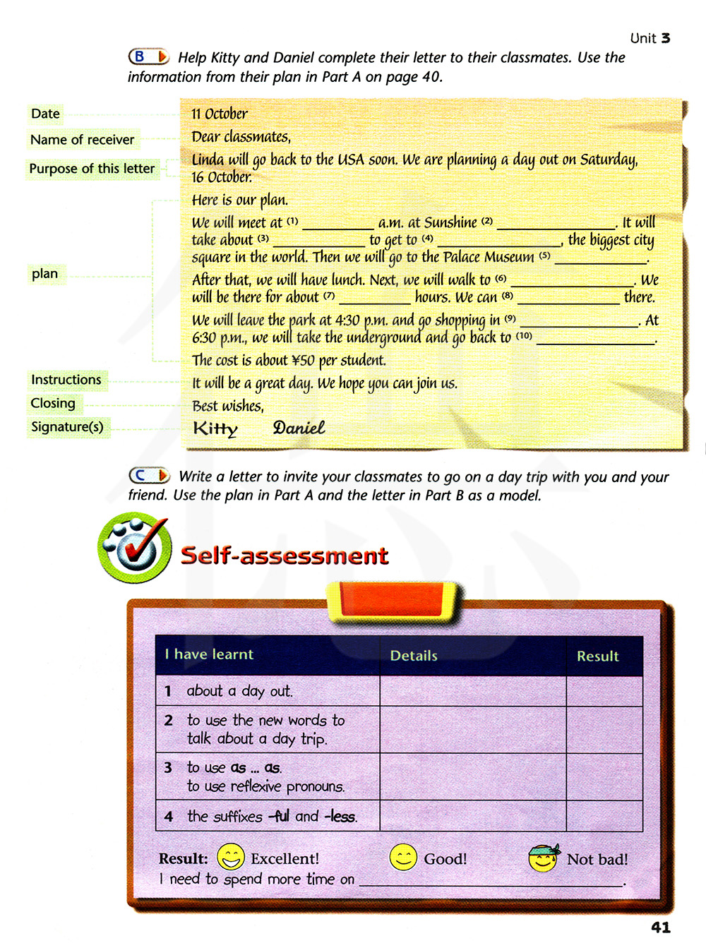 帮助吉蒂和丹尼尔完成他们写给班级同学的信。用第40页A部分他们计划中的一些信息。