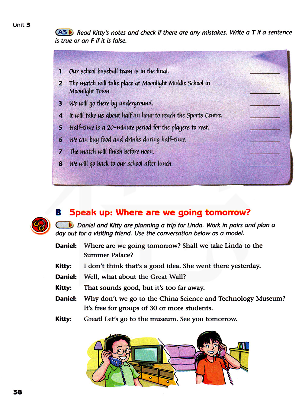 丹尼尔:我们为什么不去科技馆呢?它向有30人或更多的学生团队免费开放。 吉蒂:太好了!那我们就去科技馆吧。明天见。