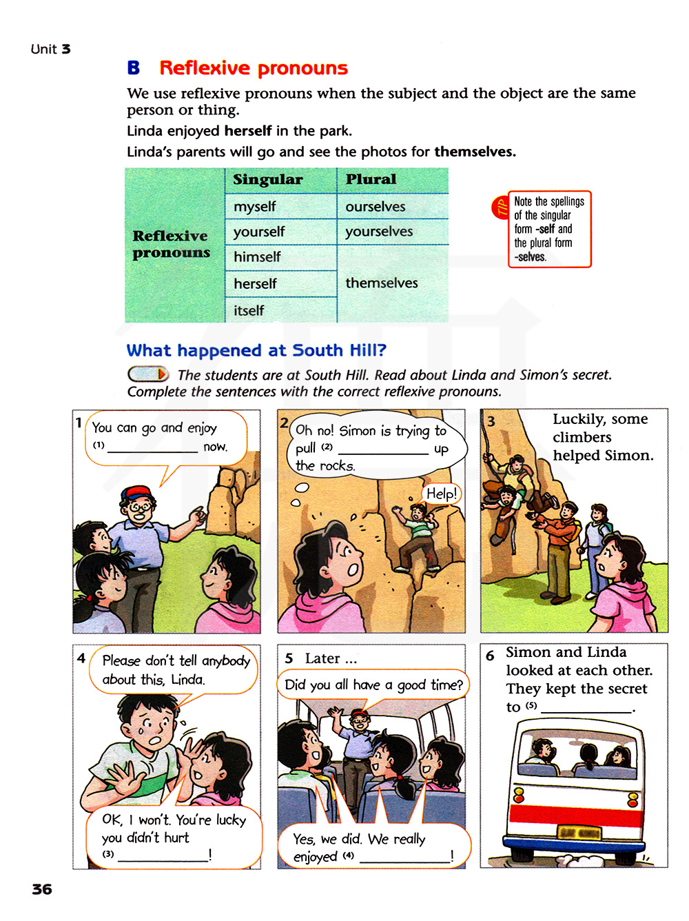 学生们来到了南山。读一读琳达和西蒙的秘密。用正确的反身代词完成下列句子。