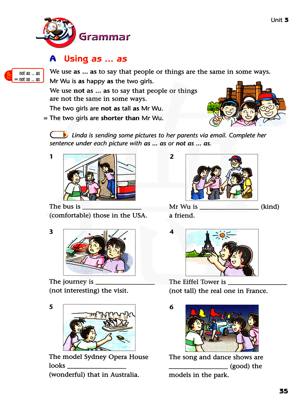 琳达正通过电子邮件给她的父母发送一些照片。用as…as或者not as…as来完成每张照片下面的句子。