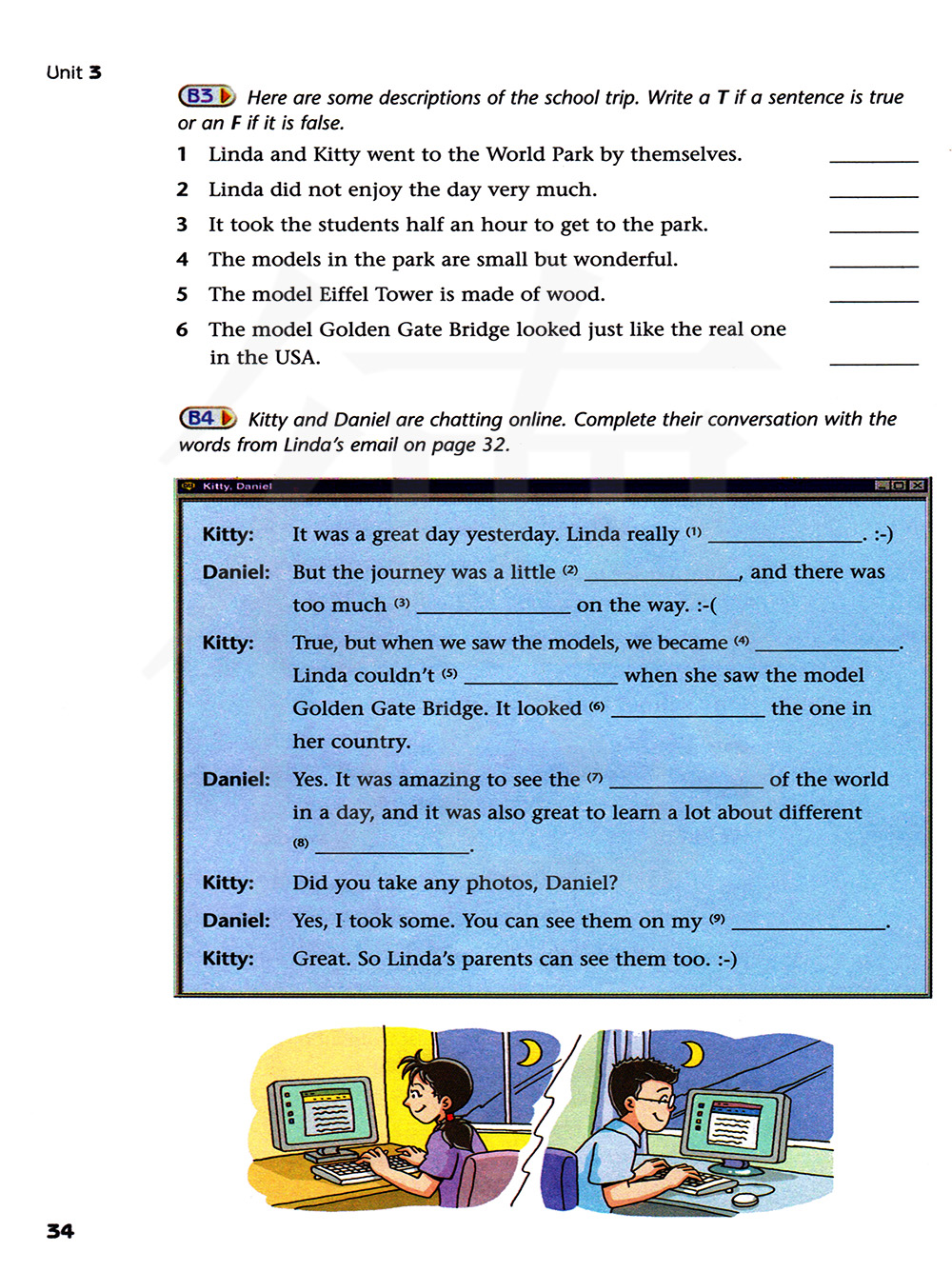 吉蒂和丹尼尔在网上聊天。用第32页琳达电子邮件中的词语来完成他们的对话。