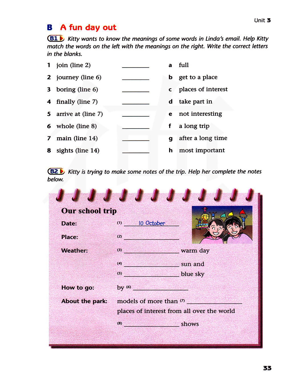 关于这次旅行,吉蒂在尝试着做一些笔记。帮助她完成下面的笔记。