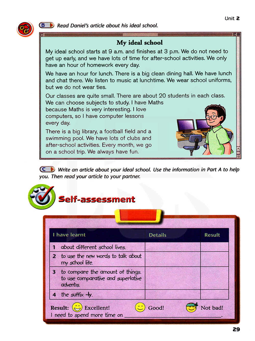 写一篇关于你理想中的学校的文章。用A部分的信息来帮助你,然后给你的搭档读一读你的文章。