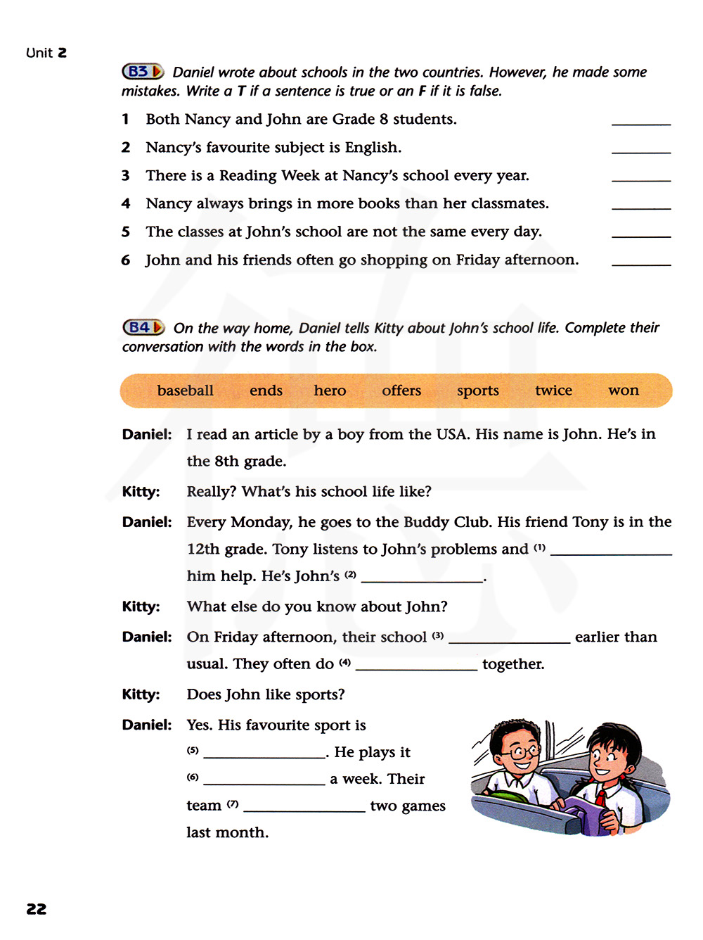 在回家的路上,丹尼尔给吉蒂讲了约翰的校园生活。用方框里的单词完成他们的对话。