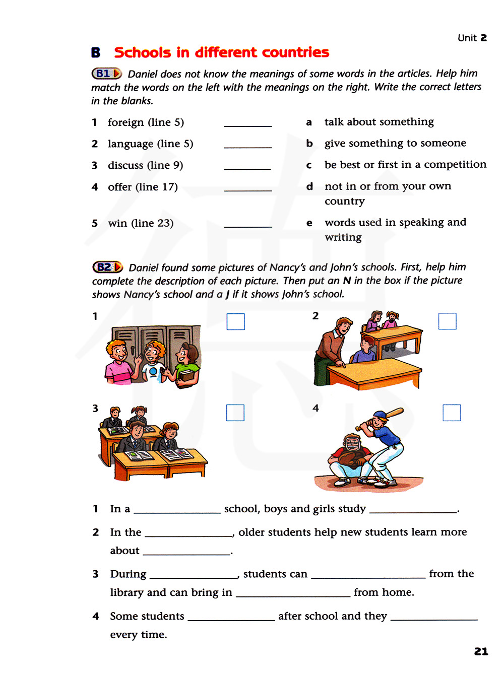 丹尼尔找到一些关于南希学校和约翰学校的图片。首先,帮助他完成对每幅图的描述。然后,看图片,如果图片表示的是南希的学校,则在旁边的方框里写上N;如果是约翰的学校,则再方框里写上J。
