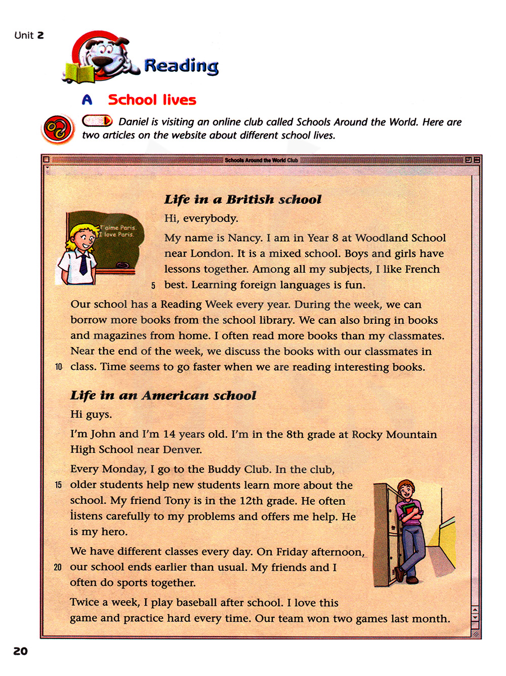 丹尼尔正在访问一个名为世界各地的学校的网上俱乐部。网站上有两篇关于不同的校园生活的文章。
