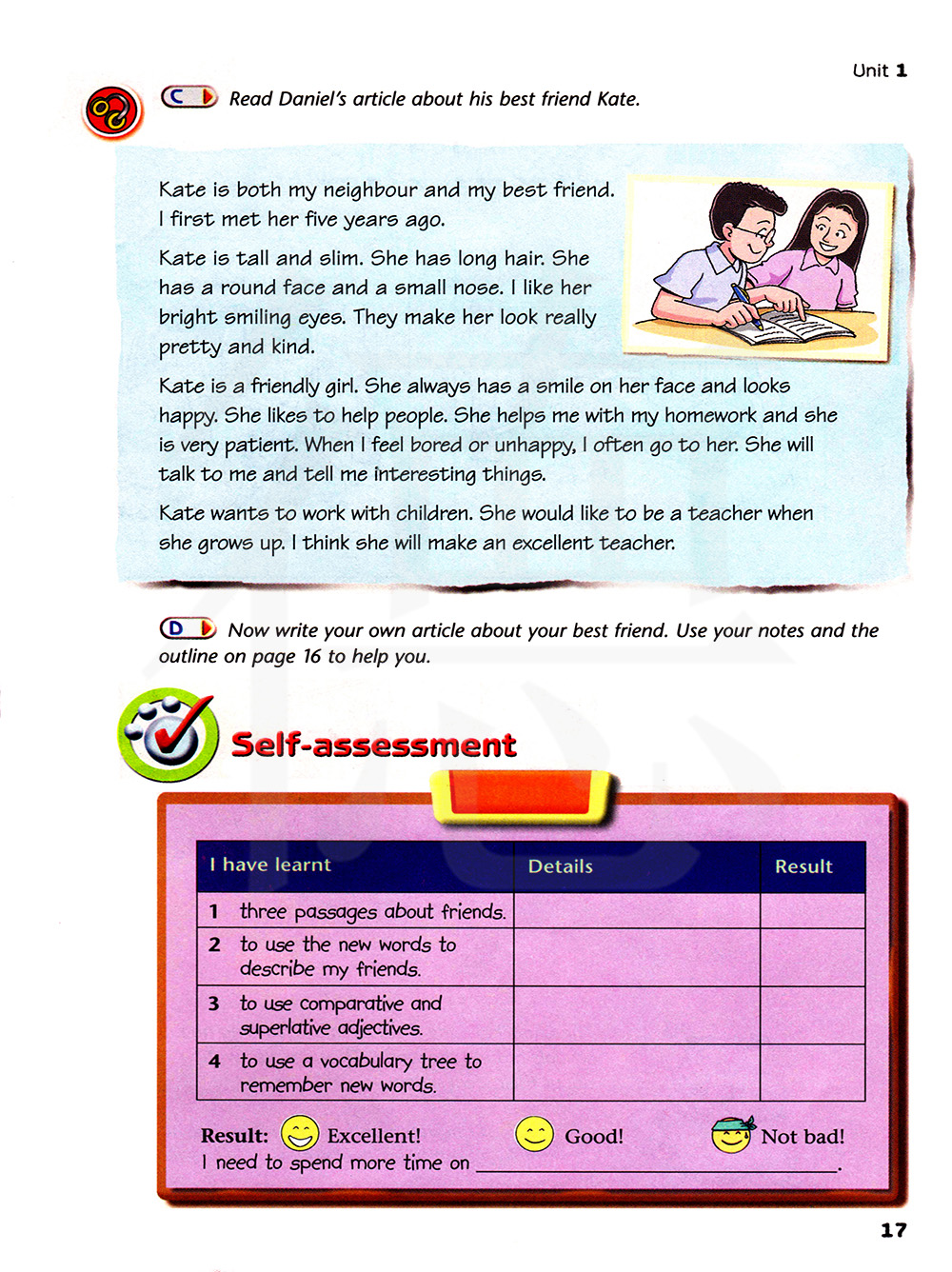 现在,请自己写一篇关于你最好的朋友的文章。用你自己的笔记和第16页的提纲来帮助你(完成写作)。