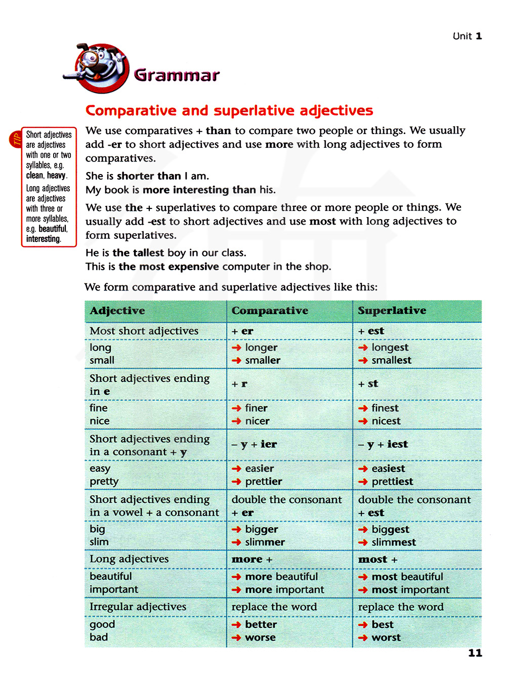 我们用比较级+than来比较两个人或事物。通常,我们在短形容词后加上-er,在长形容词前加上more来构成比较级。