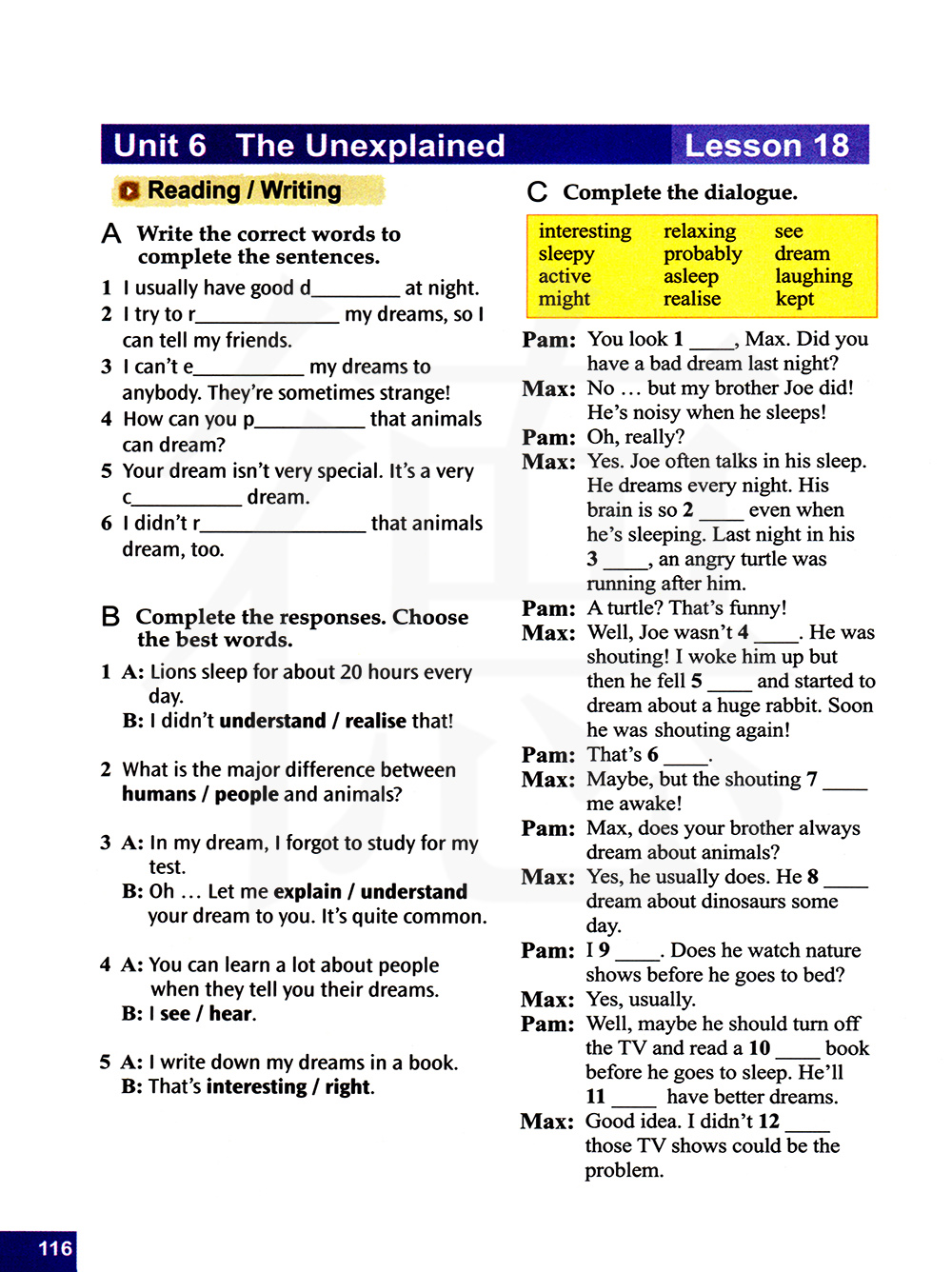 有趣的 瞌睡的,困倦的 活跃的,积极的 可能 放松的 大概,可能 睡着的 意识到 看 梦 笑 保持