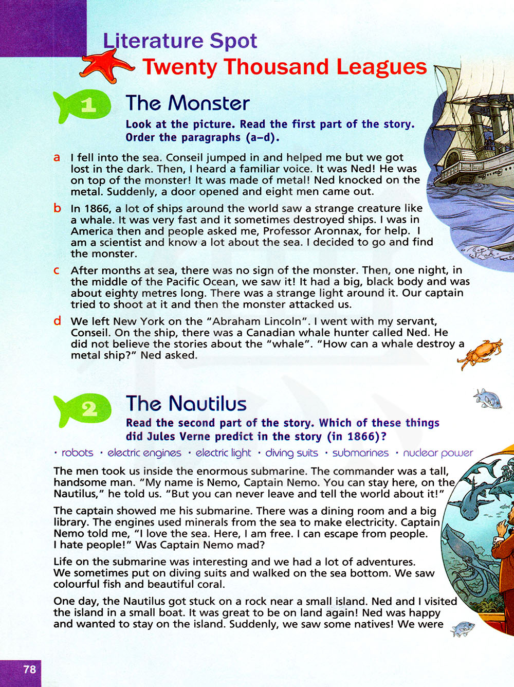 船长带我们参观了他的潜水艇,里面有一个餐厅和大图书室,发动机使用了海中的矿物质来发电。尼莫船长告诉我:“我爱大海,在这里我很自由。我可以远离人类,我讨厌人类。”尼莫船长疯了吗?