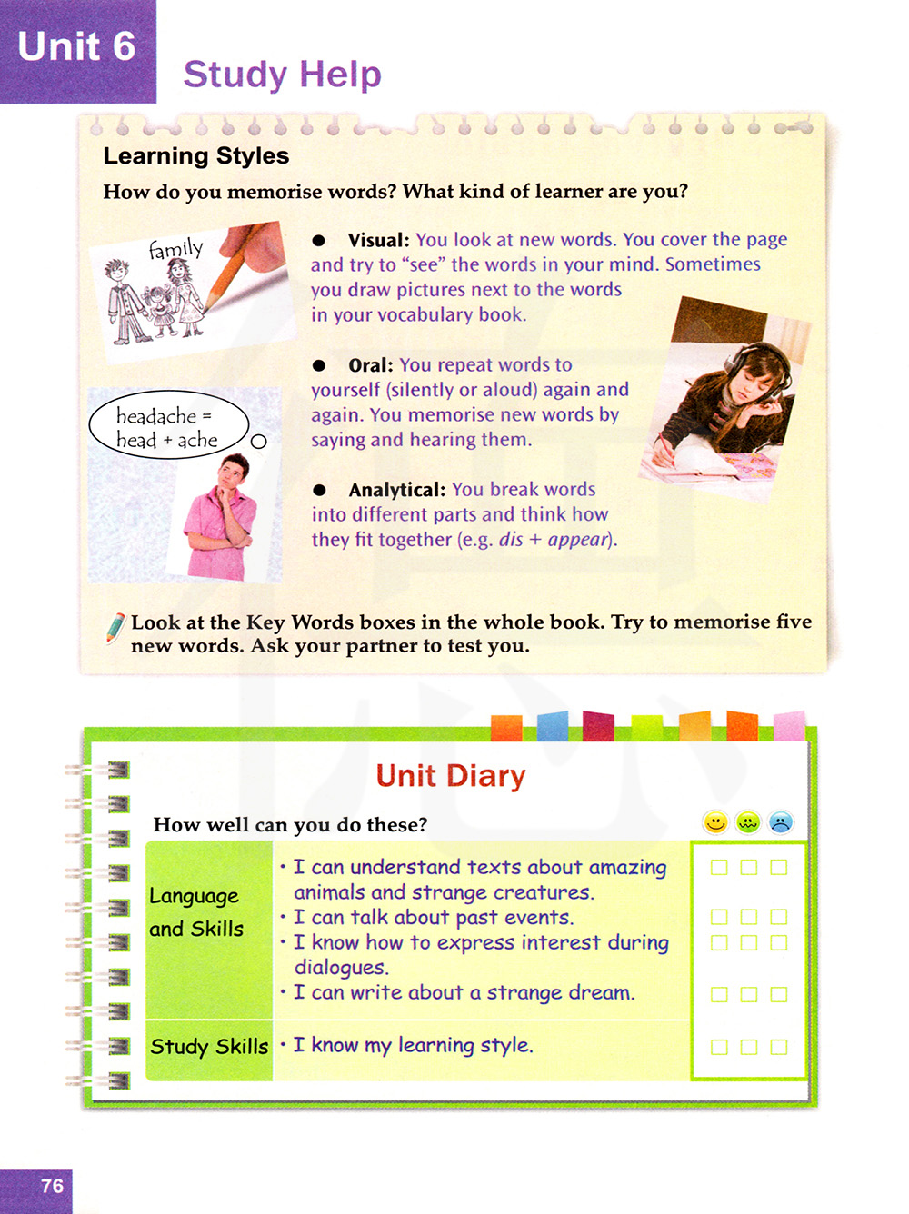 看全书关键词语的方框,试着记住五个新单词,叫你的同伴来考考你。