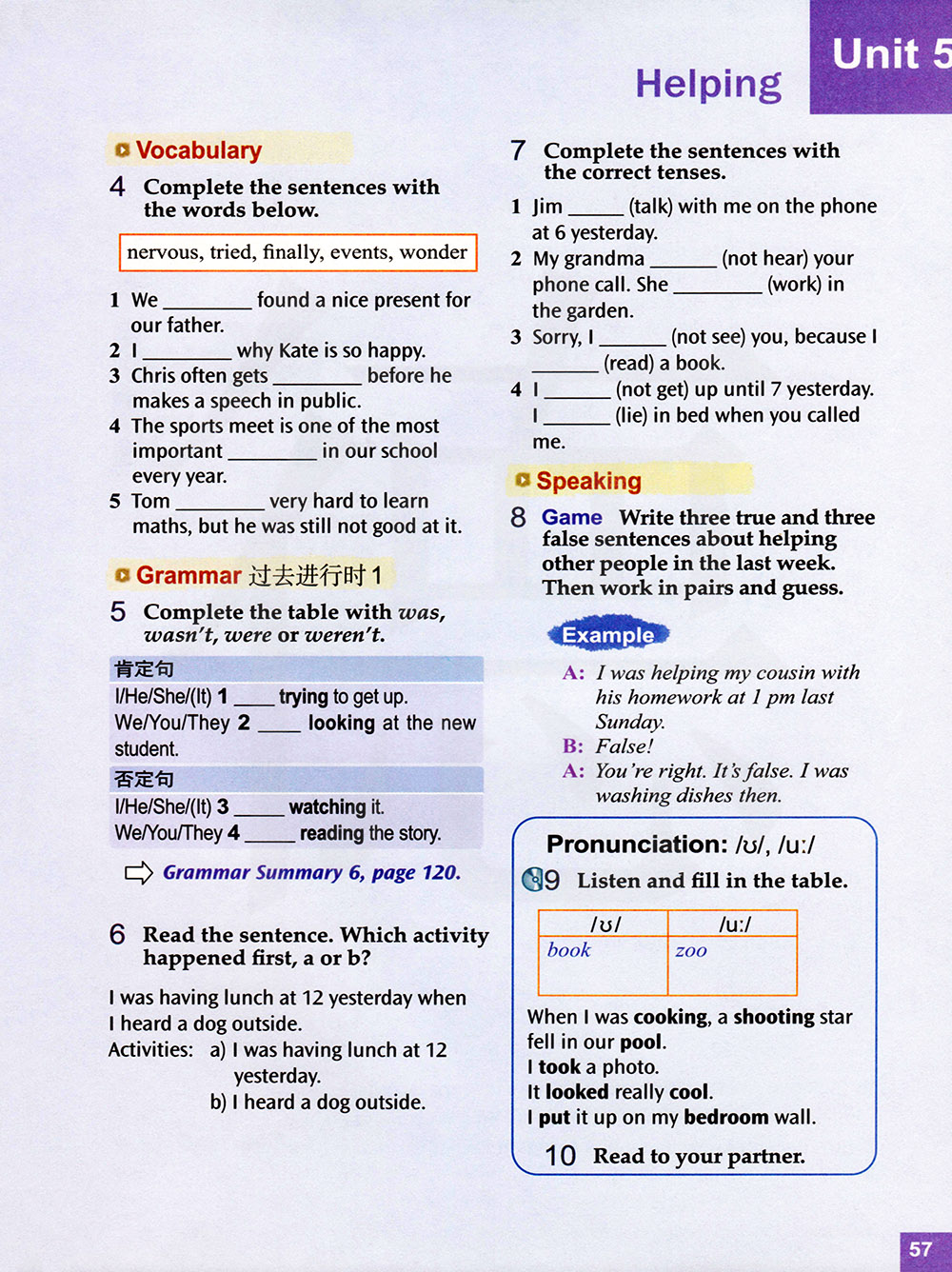 例子 上个星期日下午1点我辅导我表弟做作业。 假的。 你对了。这是假的。那时我再洗碟子。