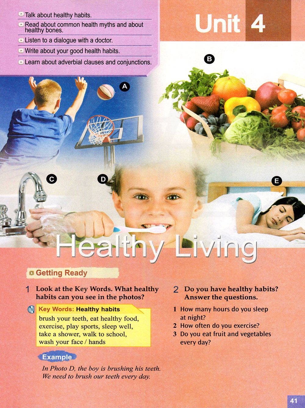 关键词语:健康习惯 刷牙,吃健康食品,锻炼,运动,睡眠质量好,洗澡,走路去学校,洗脸/手