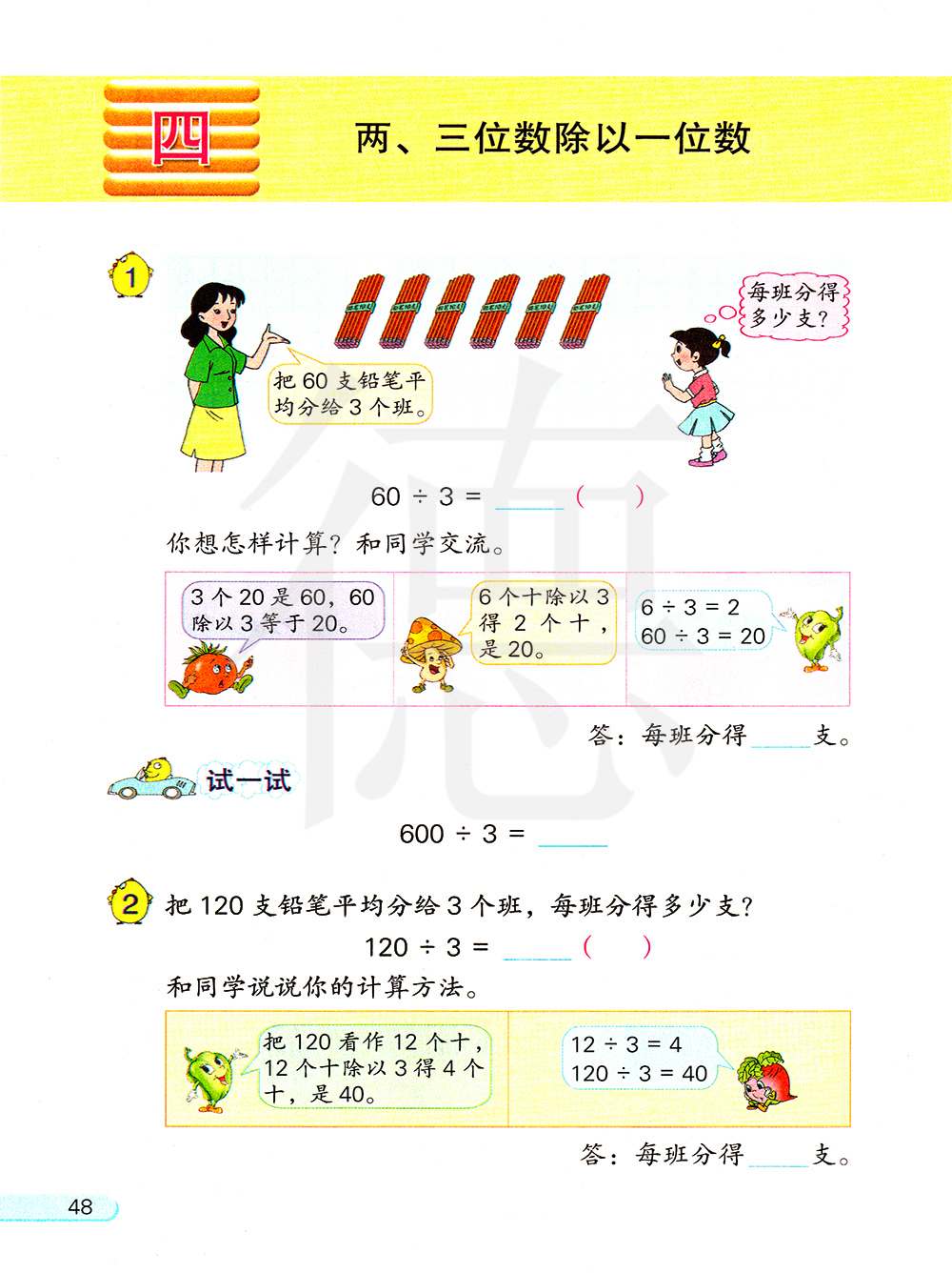 1、整十、整百数除以一位数的口算方法:先把整十、整百数后面的0挡住,再除以一位数,商是几,就再商后面加上挡住的0。