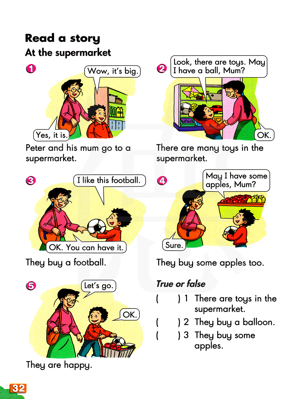 超市里有玩具 他们买了一个足球 他们也买了一些苹果
