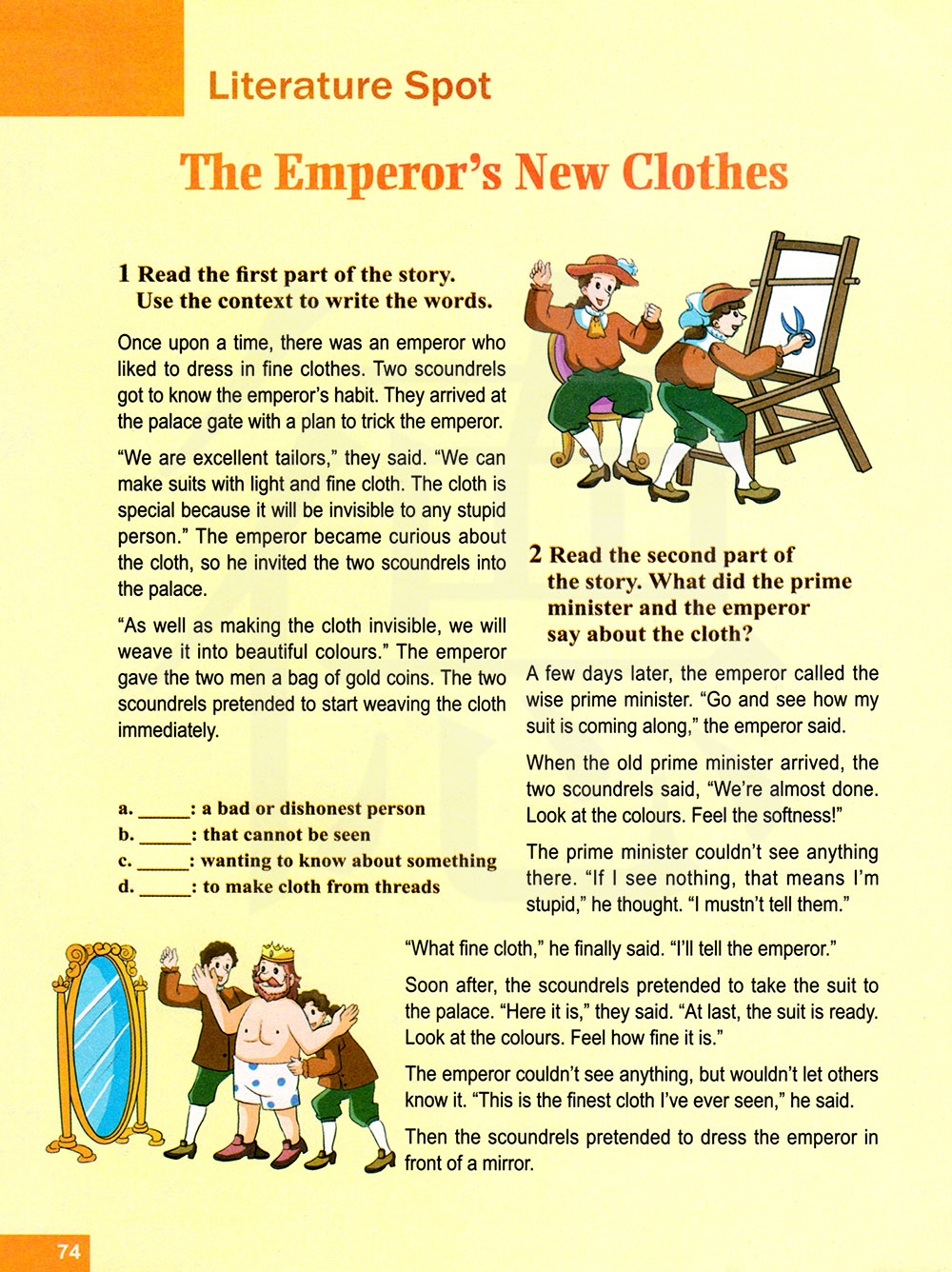 从前,有一个皇帝,他喜欢穿漂亮的衣服。两个无赖知道了黄帝的习惯。他们来到宫门,计划要欺骗皇帝。