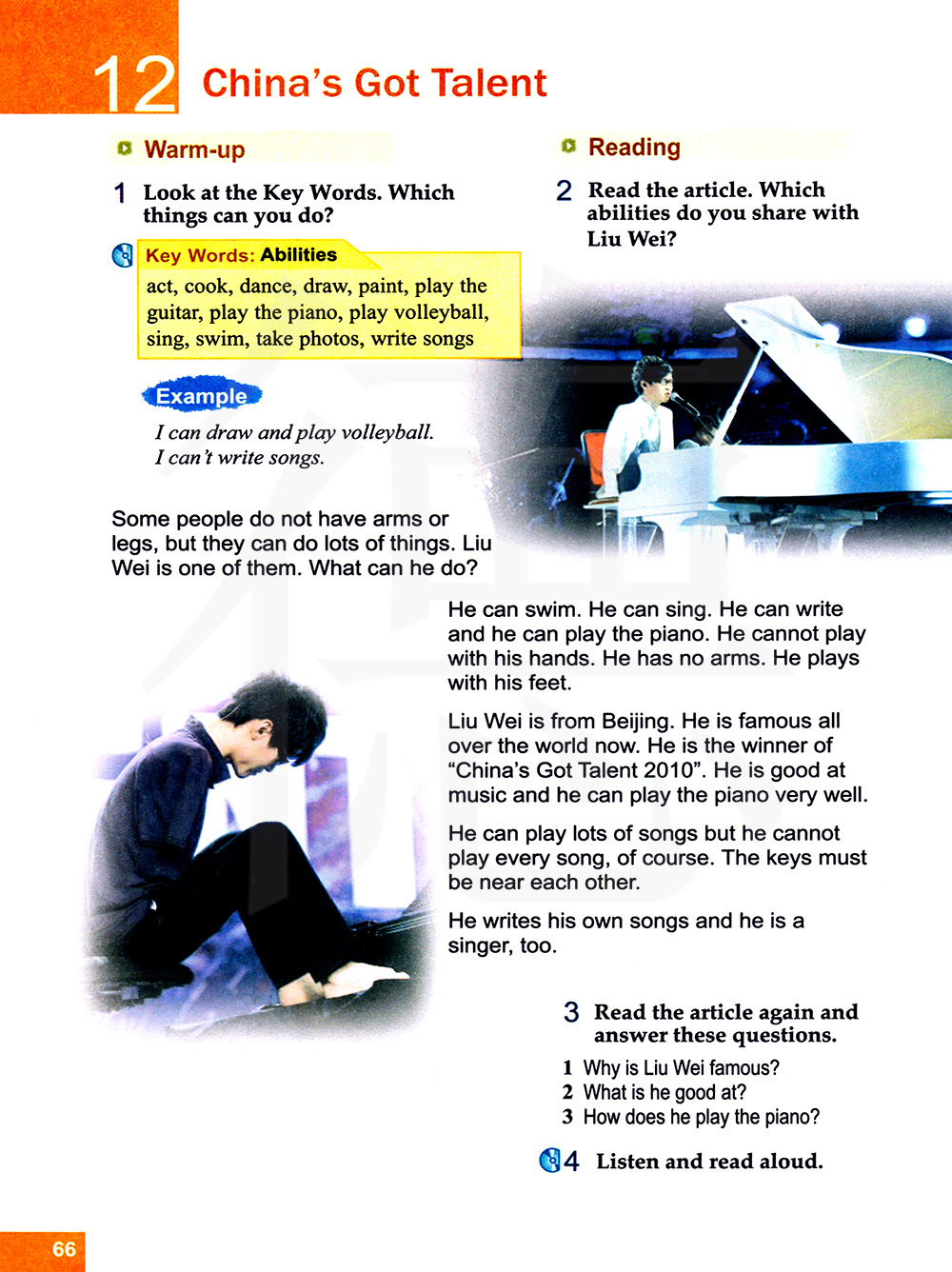 刘伟来自北京。他现在世界闻名。他是“2010中国达人秀”的冠军。他擅长音乐,钢琴弹得也很好。
