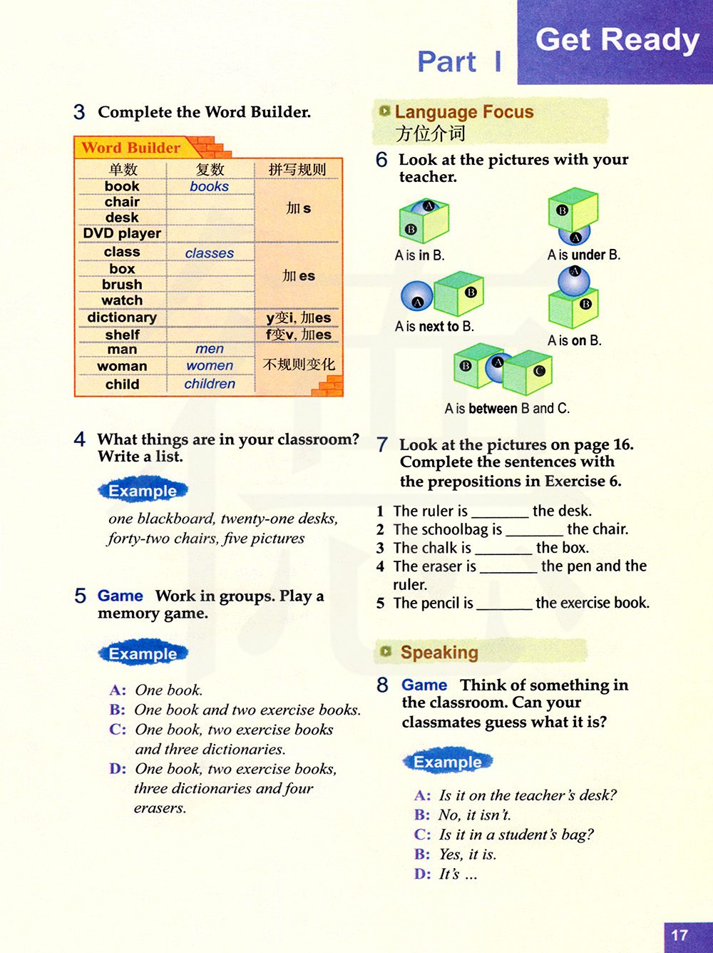 A在B的里面。A在B的下面。A在B的旁边。A在B的上面。A在B和C之间。