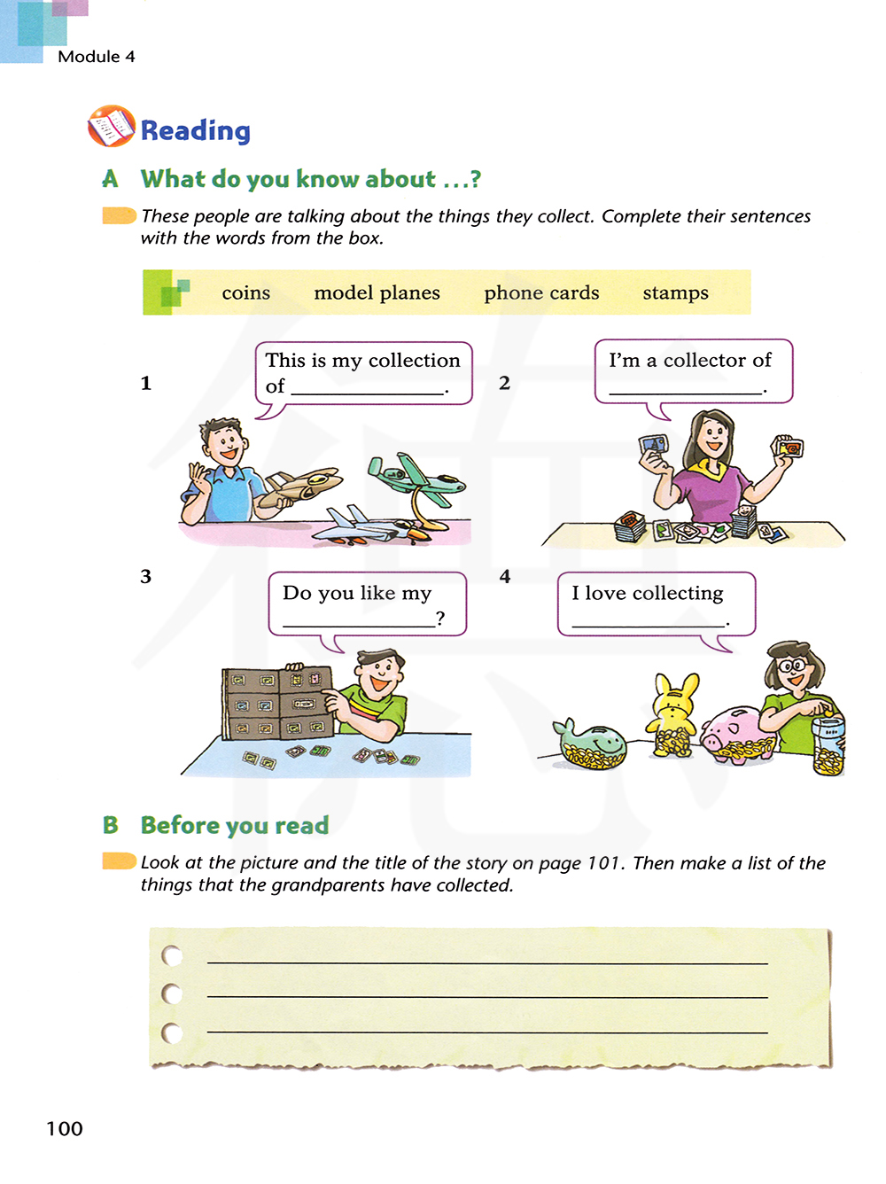 看图片和故事的标题在第101页。然后把祖父母收集到的东西列个单子。