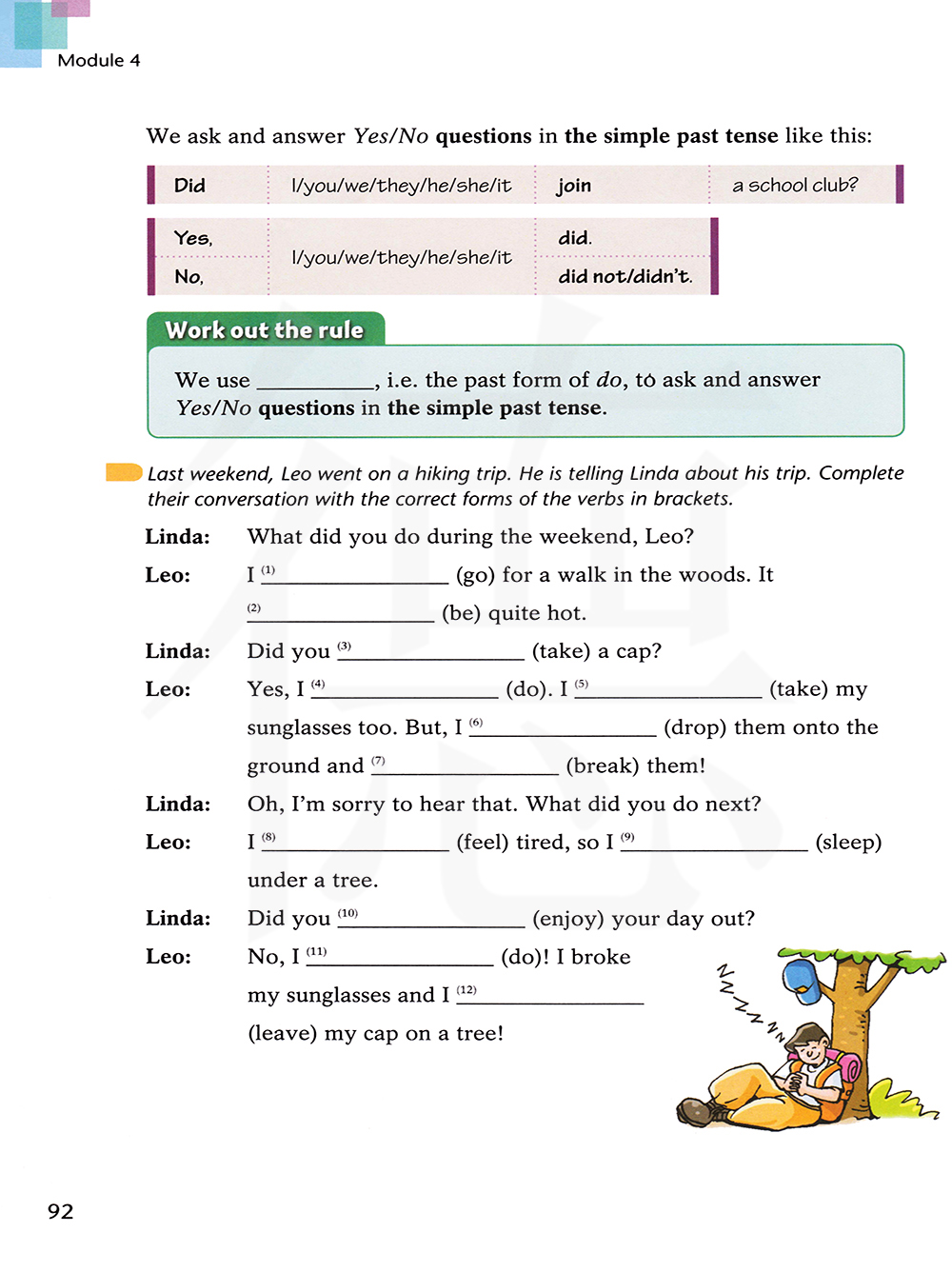 上周末,利奥去徒步旅行了。他正在告诉琳达他的旅行经历。用括号中动词的正确结构完成他们的对话。