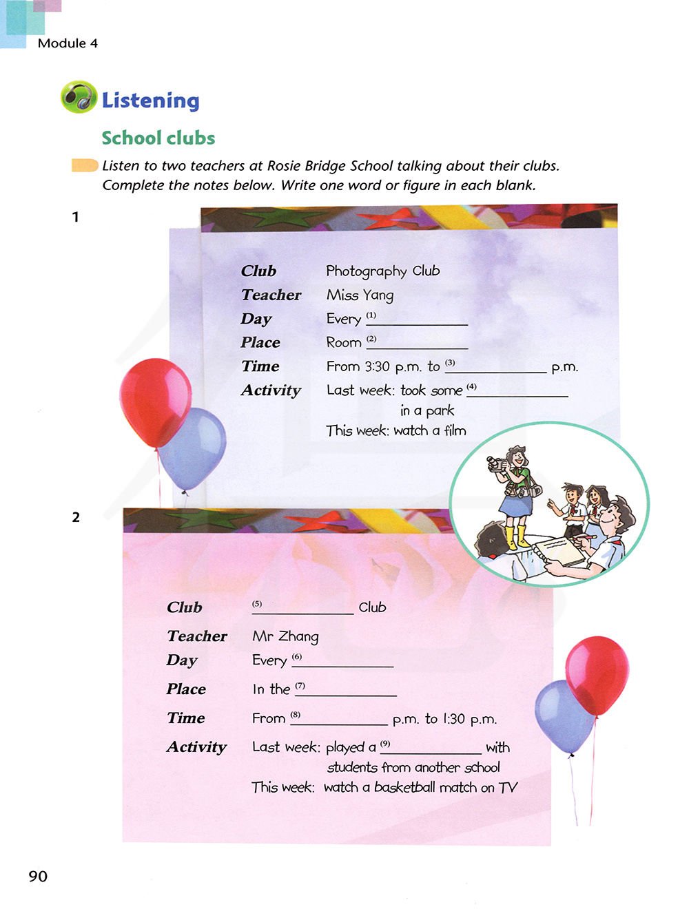 听两位在罗西桥学校的老师谈论他们的俱乐部。完成下面的笔记。