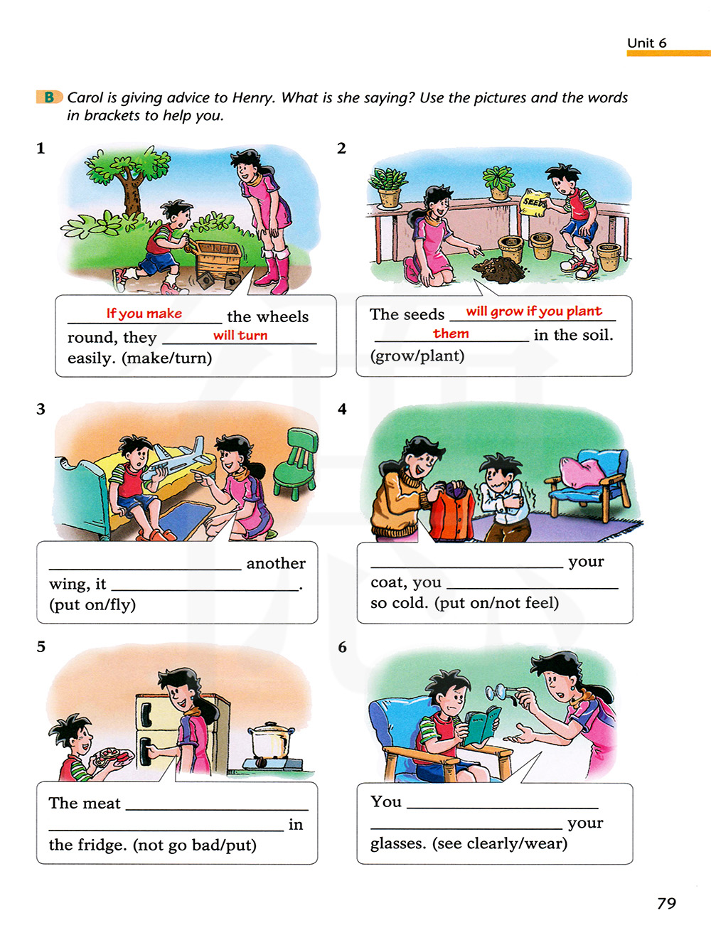 卡罗尔正在给亨利提建议。她在说什么?利用图片和括号里的单词帮助你。