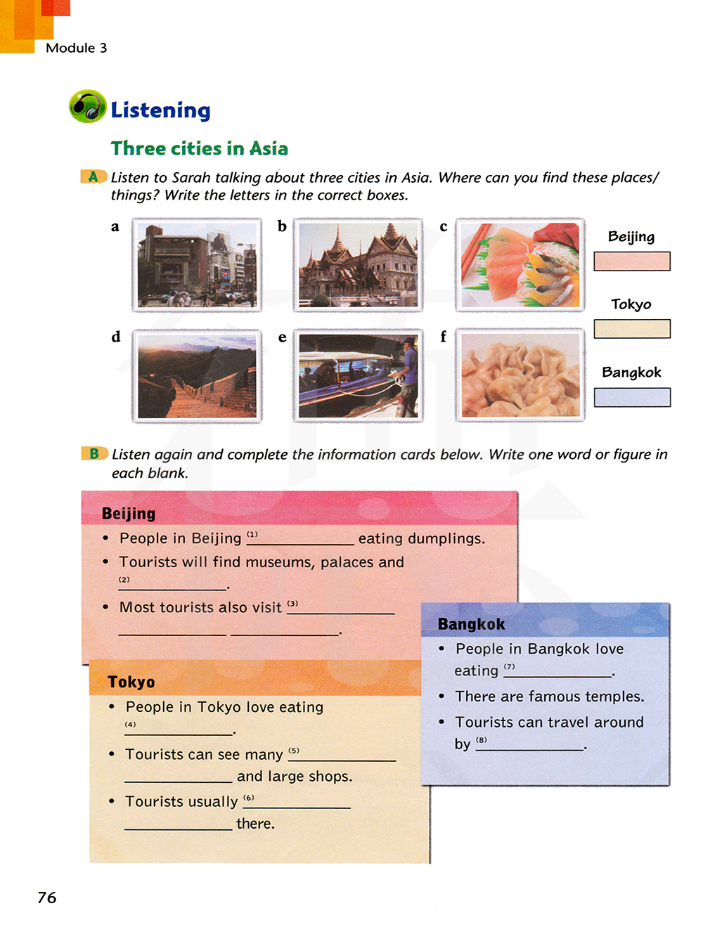 听萨拉谈论亚洲的三座城市。你能在哪里找到这些地方。