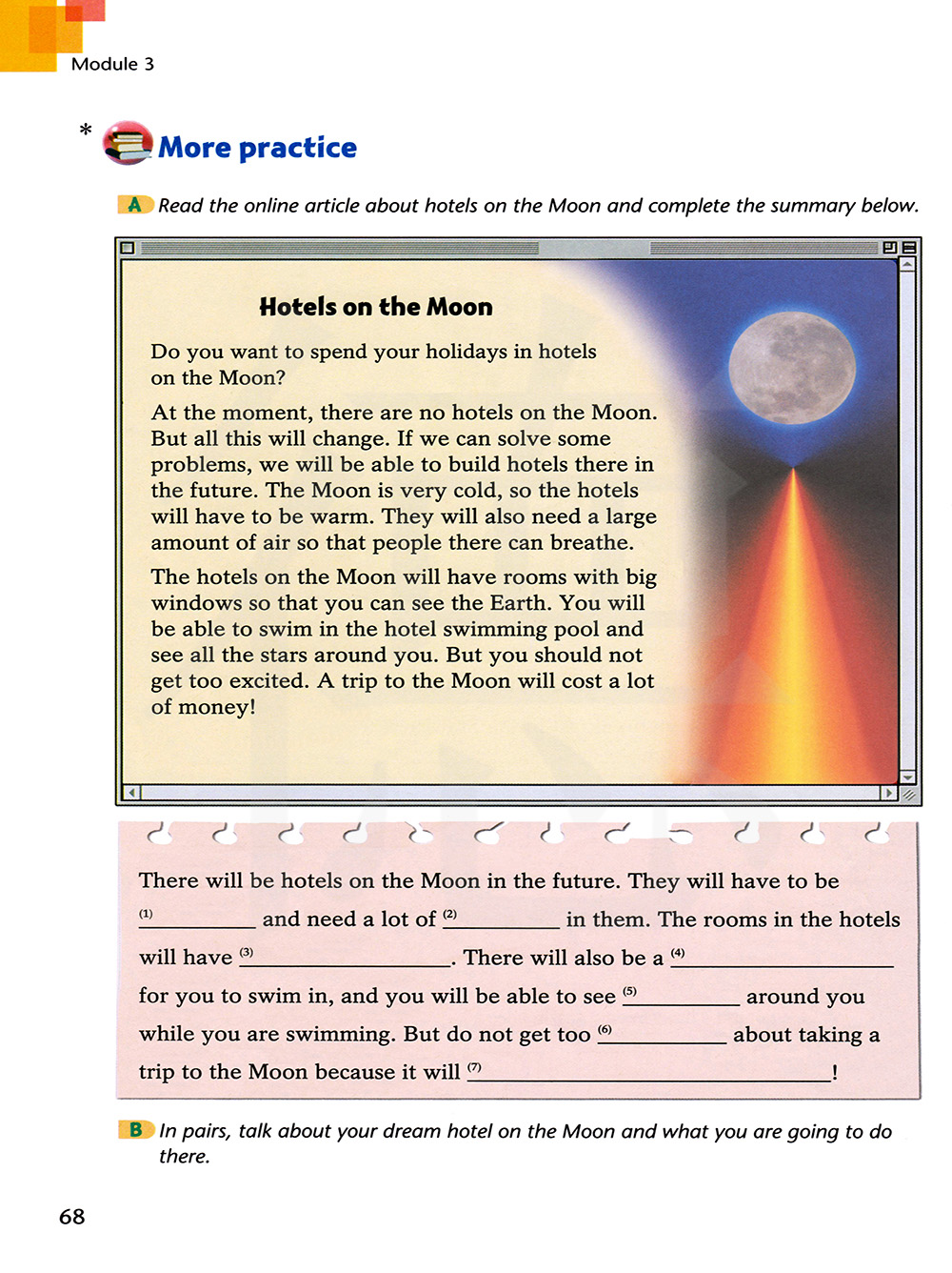 月球上的旅馆将有大窗户的房间,这样你就能看到地球。你可以在酒店的游泳池里游泳,看到周围的星星,但你不应该太兴奋,去月球旅行要花很多钱!