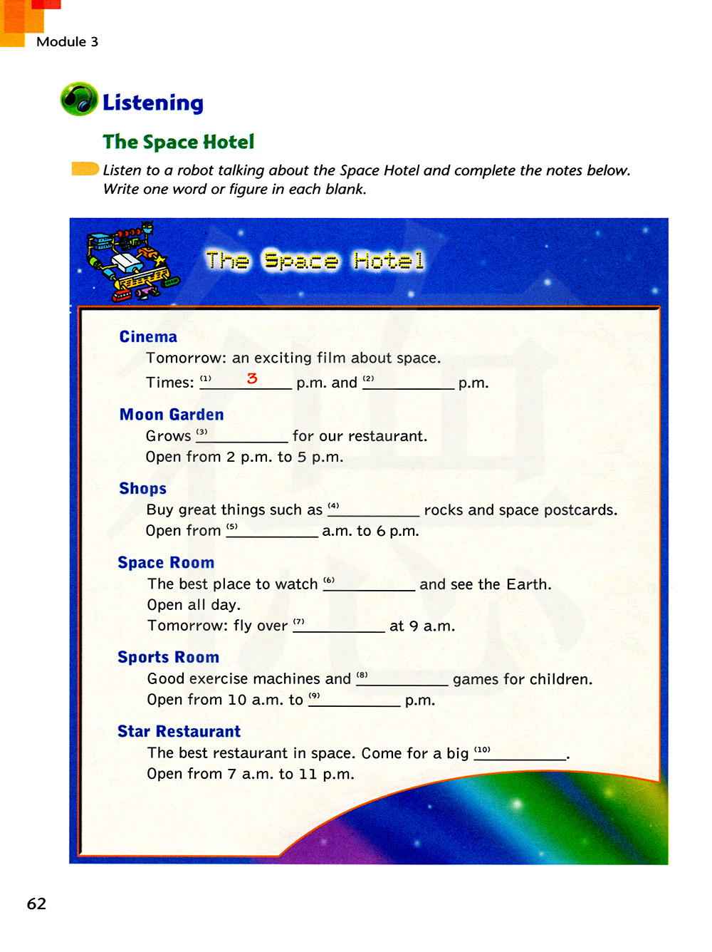 听机器人谈论太空旅馆并完成以下记录。在每个空格上填写。