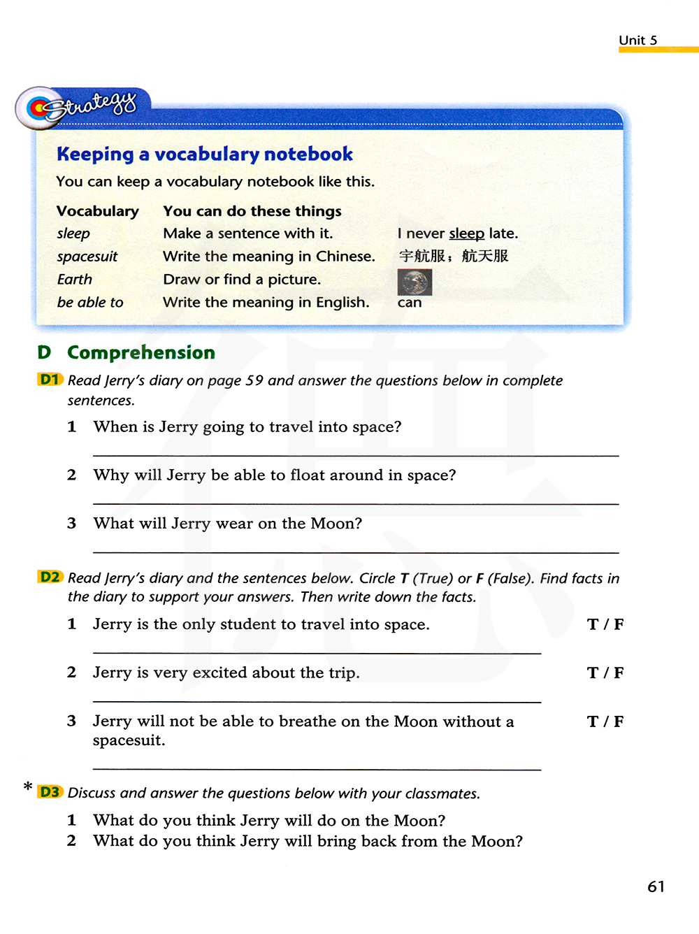 阅读59页杰里的日记并用完整的句子回答以下问题。
