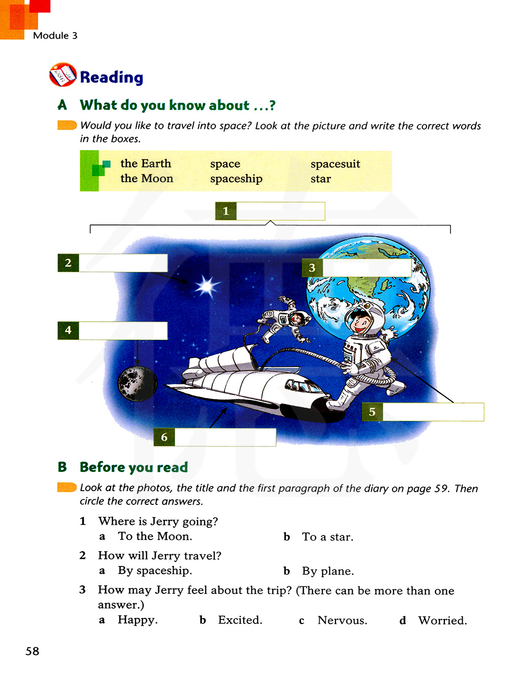 你想去太空旅行吗?看图并在方框中写上正确的单词。