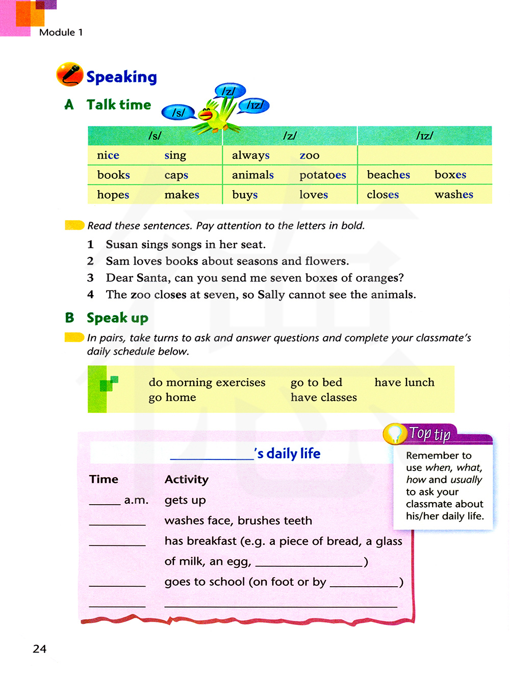 小技巧 记得使用“when”,"what","how"和"usually"告诉你的同班同学你的日常生活。