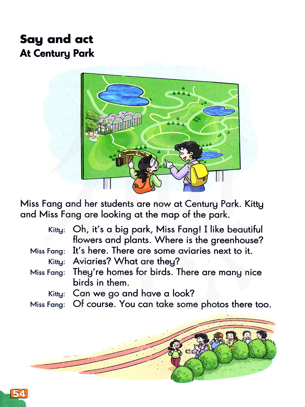 哦,这公园很大呀,方老师,我喜欢漂亮的花和植物,植物温室在哪? 在这儿,它旁边还有鸟舍
