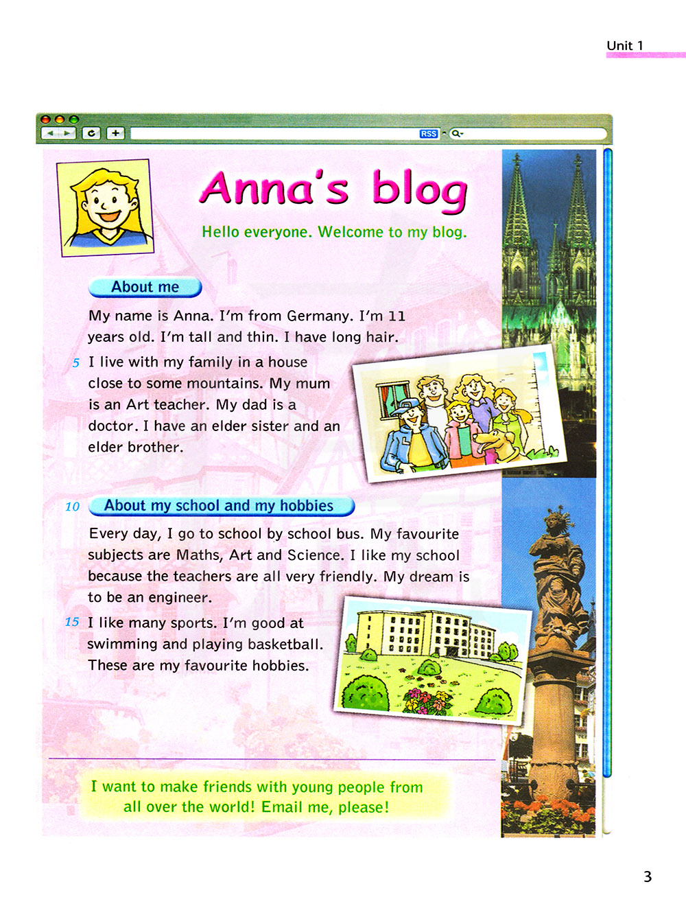 我叫安娜,我来自德国。我11岁了。我又高又瘦。我有一头长发。