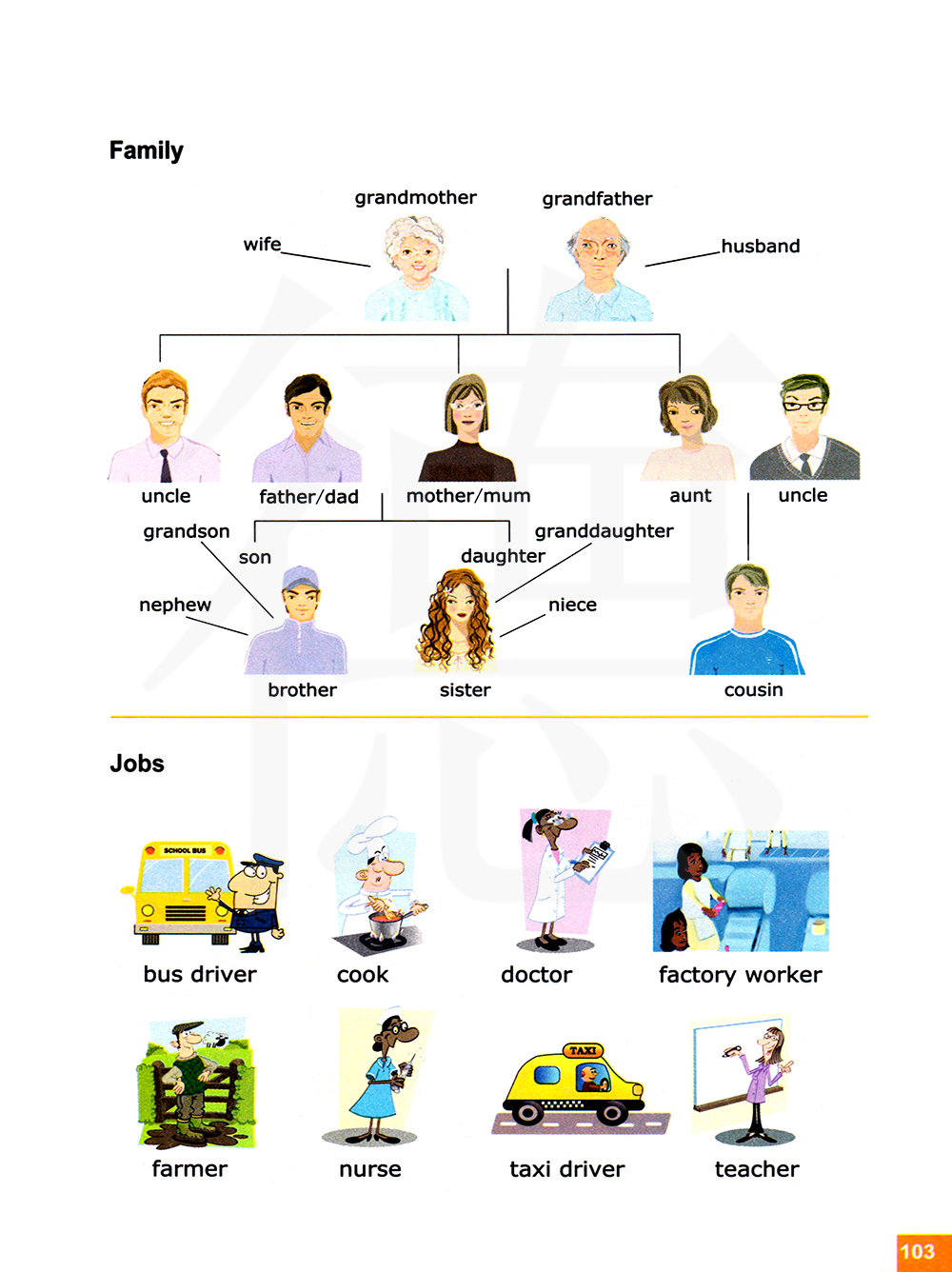 妻子/祖母 丈夫/祖父 伯伯 父亲/爸爸 母音/妈妈 姑姑 姑父 孙子 儿子 女儿 孙女 侄子 侄女 哥哥 妹妹 表哥