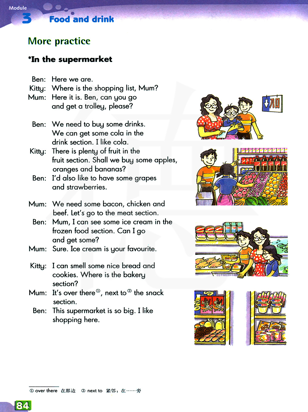 我们需要一些熏肉,鸡肉和牛肉。我们去肉类区吧。妈妈,我在冷冻食品区看到了一些冰淇淋。我能去拿一些吗?可以。冰淇淋是你的最爱。
