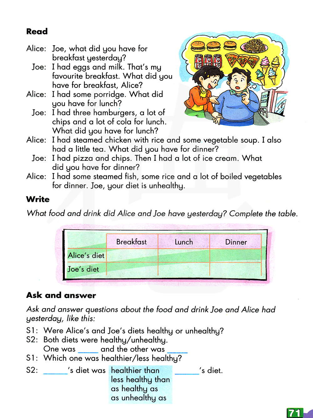 我吃了一些鸡肉蒸饭和一些蔬菜汤。我还喝了一些茶。你晚餐吃了什么?我吃了比萨和薯条。然后我吃了很多冰淇淋。你晚餐吃了什么?我晚餐吃了一些蒸鱼,一些米饭和很多炒蔬菜。乔,你的饮食不健康。