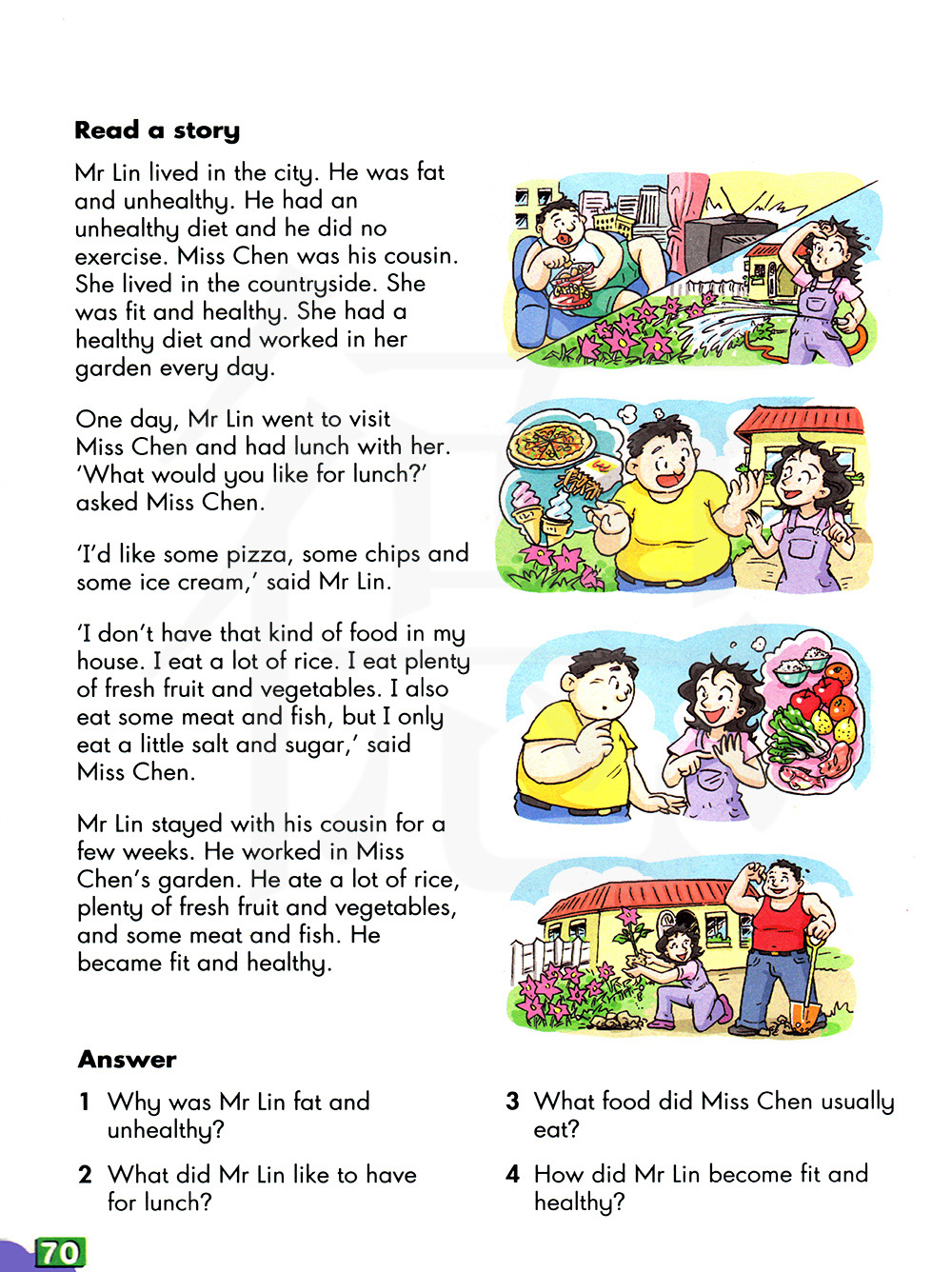 林先生和他的表妹一起住了几个星期。他在陈小姐的花园里劳动。他吃很多米饭,大量的水果和蔬菜和一些肉和鱼。他变得健康了。