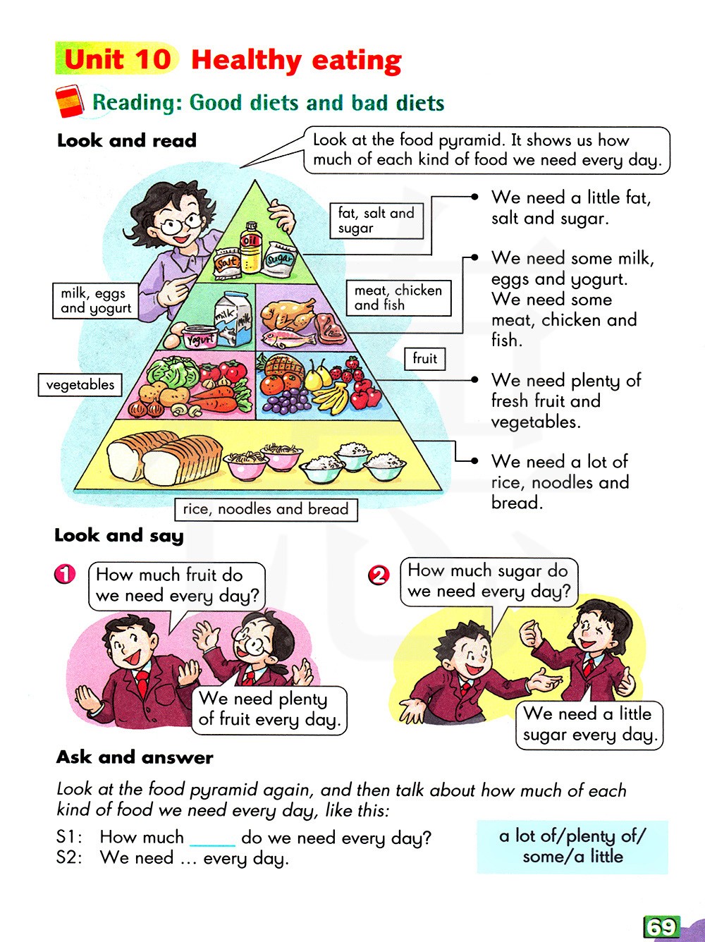看这个食物金字塔。它显示了我们每天需要的各种食物的数量。