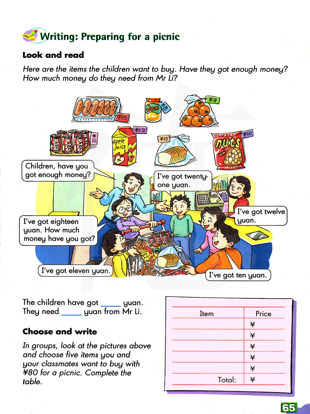 分小组,看上面的图片,选出野餐你们想买的五样东西,这些东西必须在80元以内。完成表格