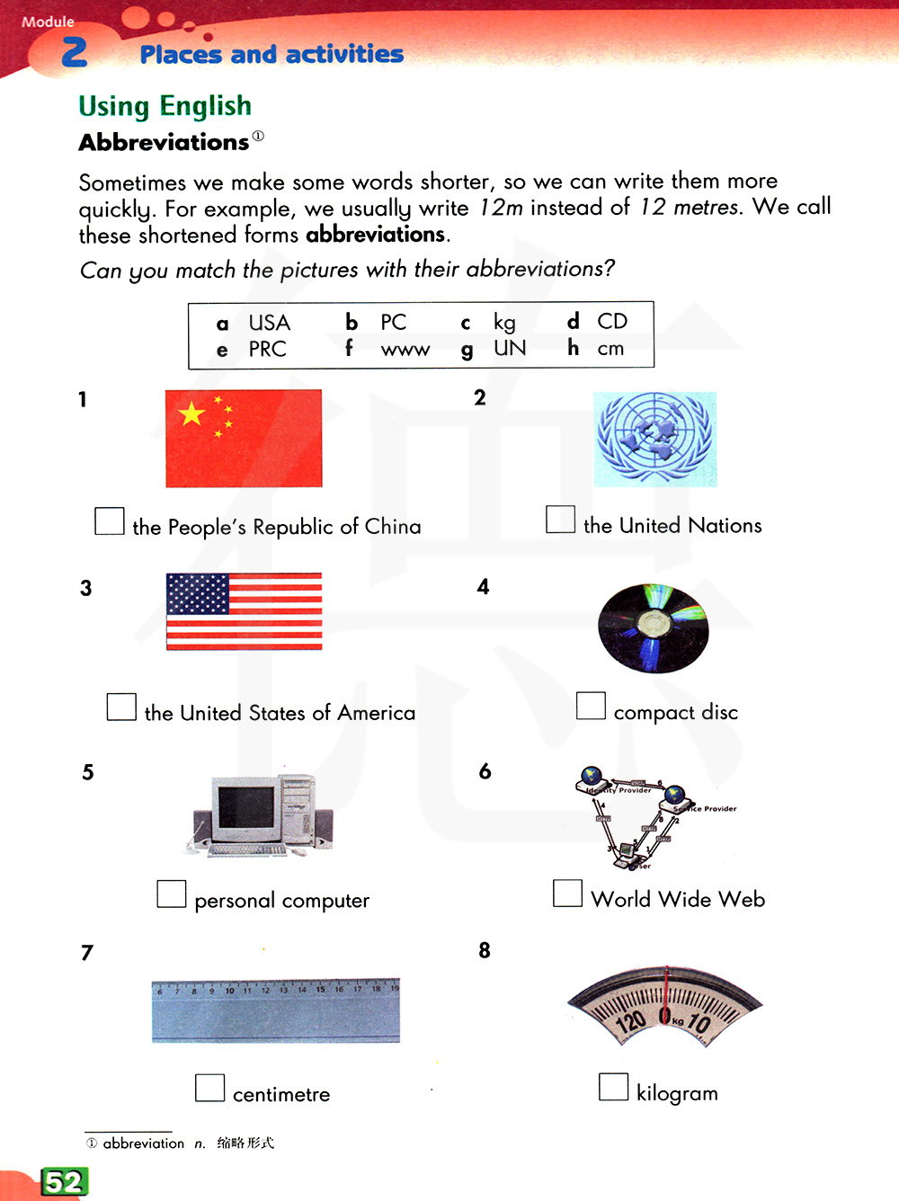 你能把下面的图片和他们的缩写连起来吗?