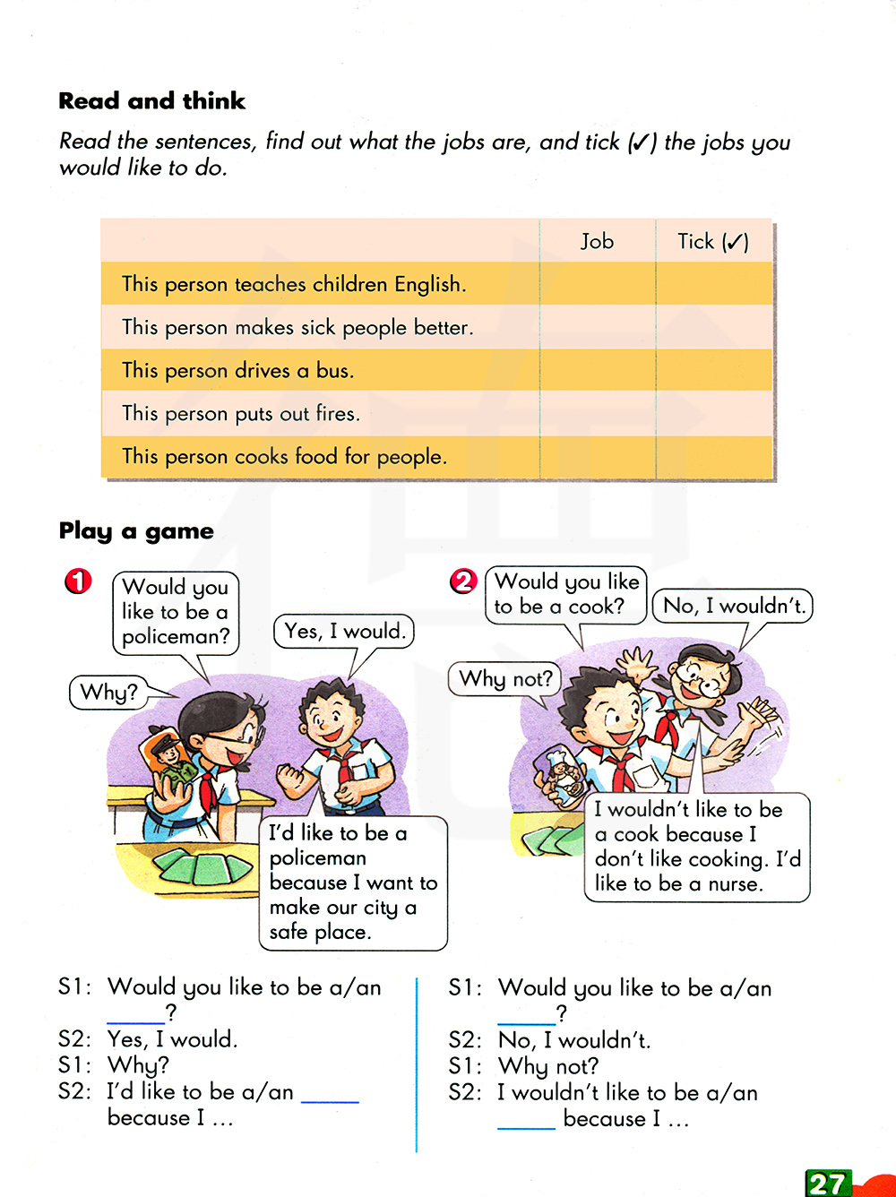 读下面的句子,说说他表示的是什么工作,你在想做的工作后面打勾。