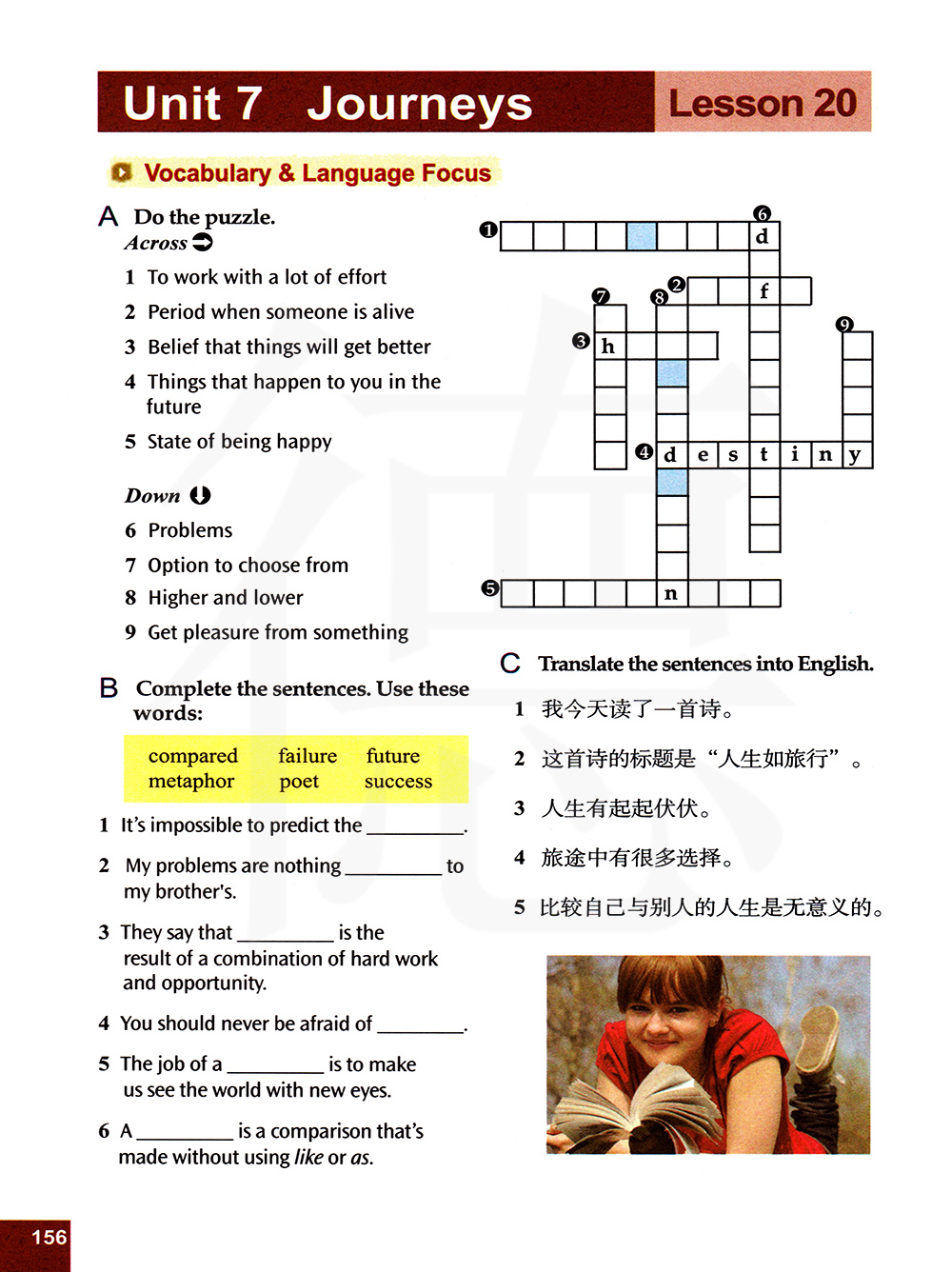 完成字谜。 横向 很努力地工作 某人活着的时间 相信事情会变好 未来发生在你身上的事情 很开心状态