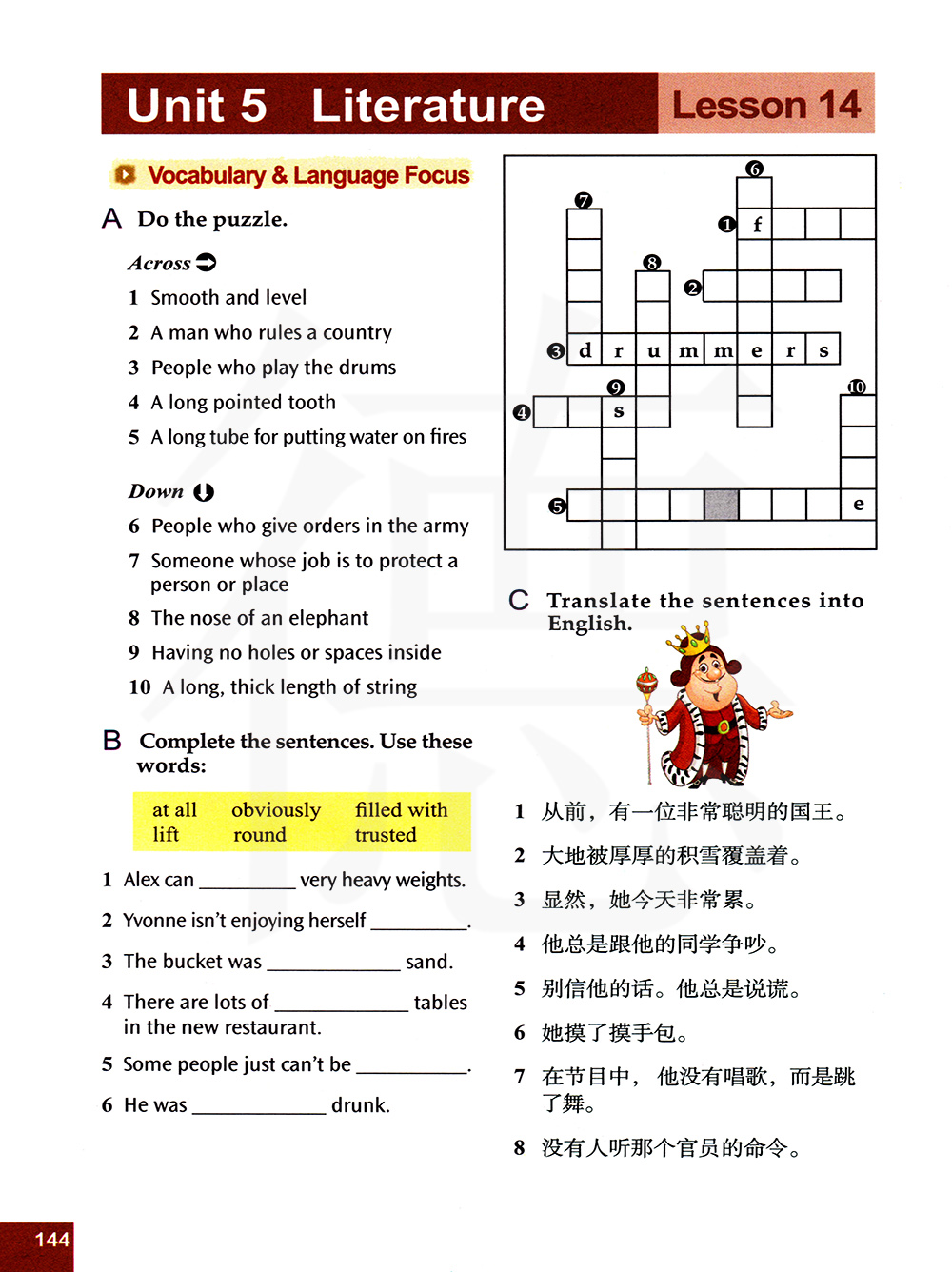 横向 光滑平坦 统治一个国家的人 打鼓的人 一颗长长的尖牙 一根用来装水灭火的长水管
