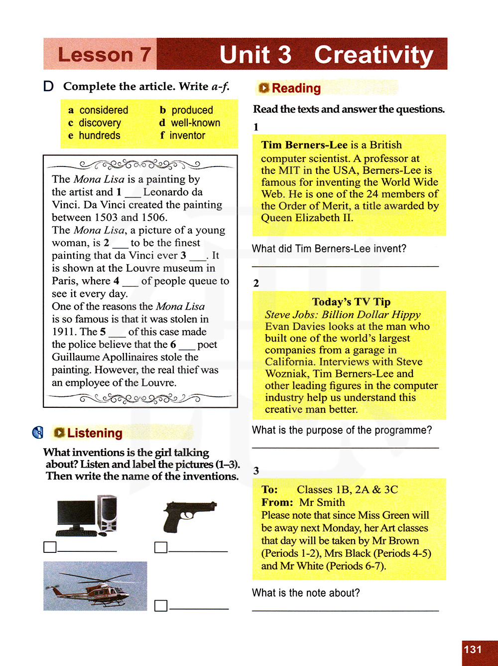 听力 这个女孩在谈论什么发明?听录音,给图片标号(1-3)。然后写出发明物的名字。