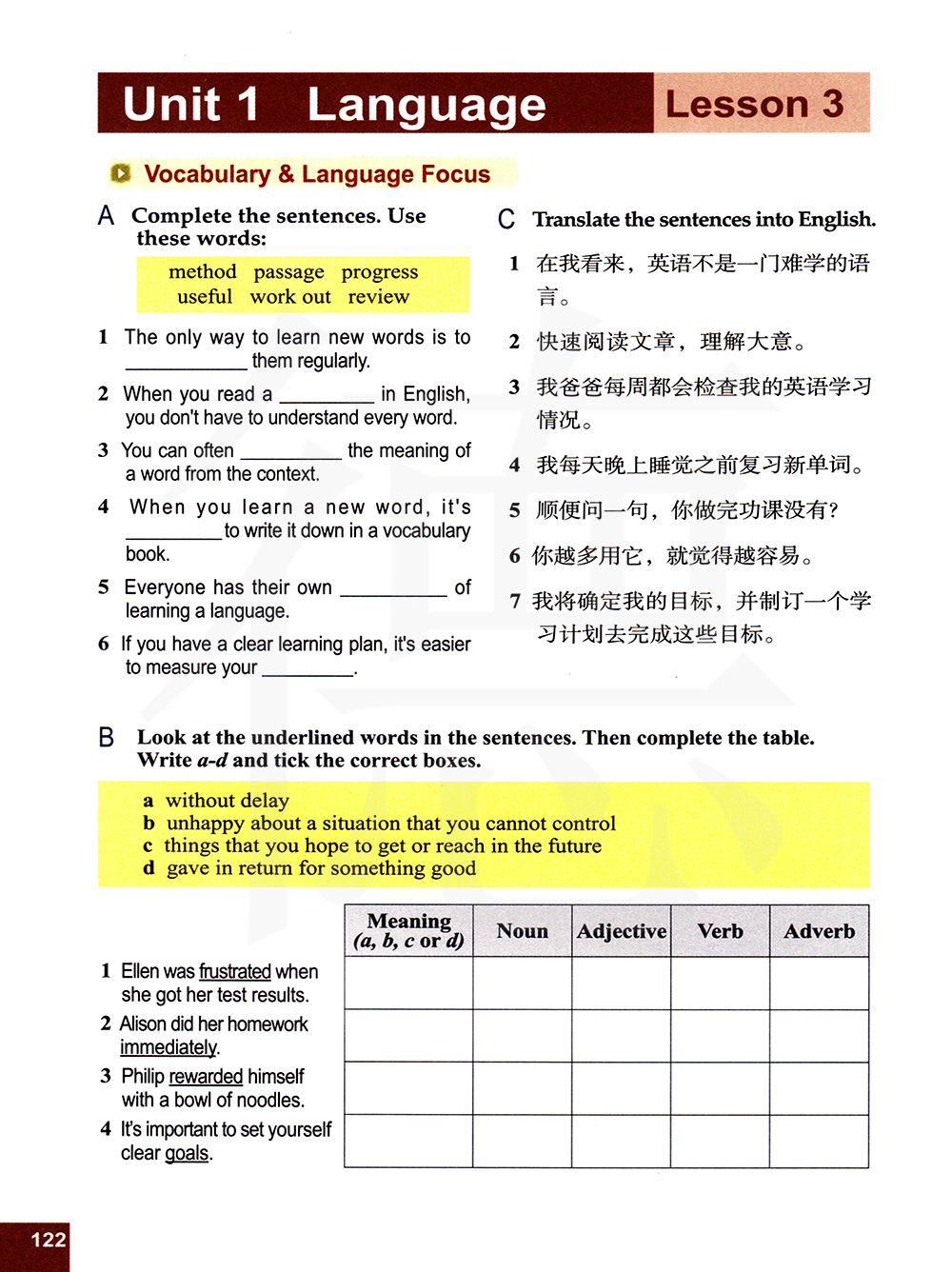 看一看这句子中的下划线的单词。然后完成表格。写a-d并在恰当的方框里打勾。